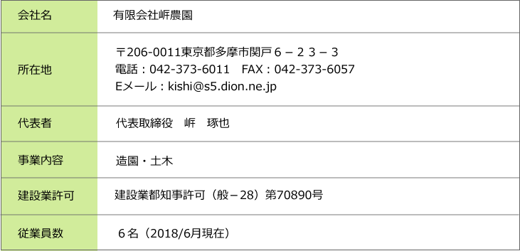 多摩市の緑化に関わってきました。もちろん農家も続けております。近年の公園は、P-PFI、環境保全、防災拠点、地域の活性化など利用価値が上がり、それに伴い緑に対する認識や安全性が必要としています。弊社は、この緑を植物の特徴に合わせた管理を行い、